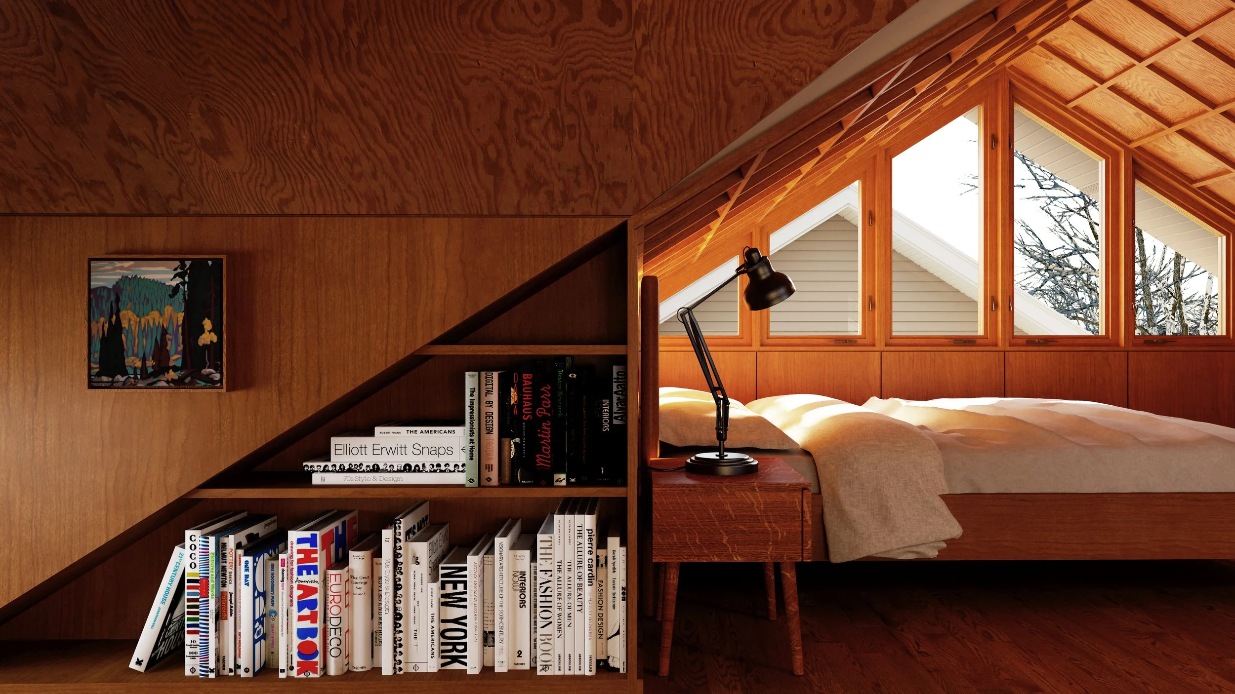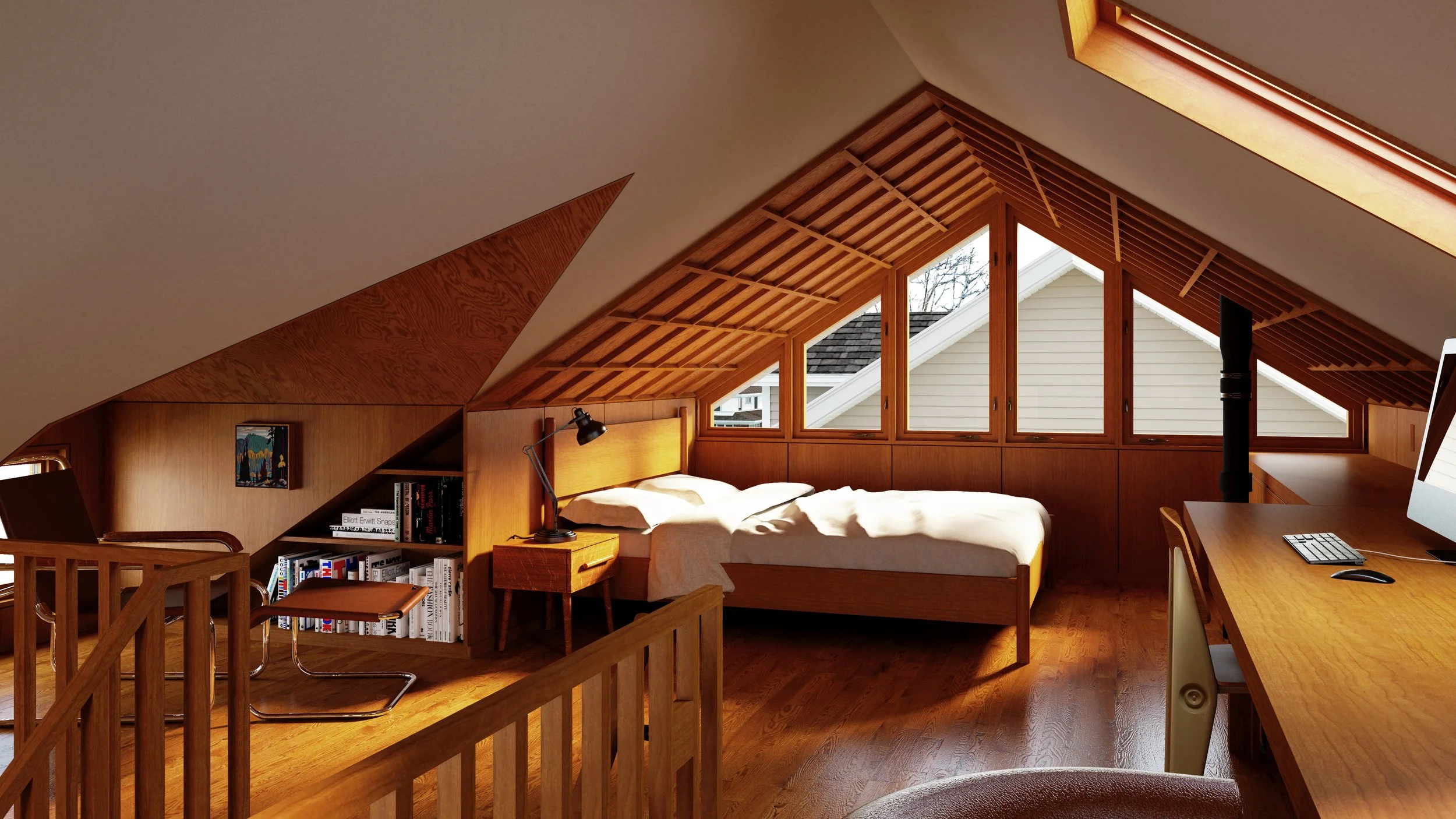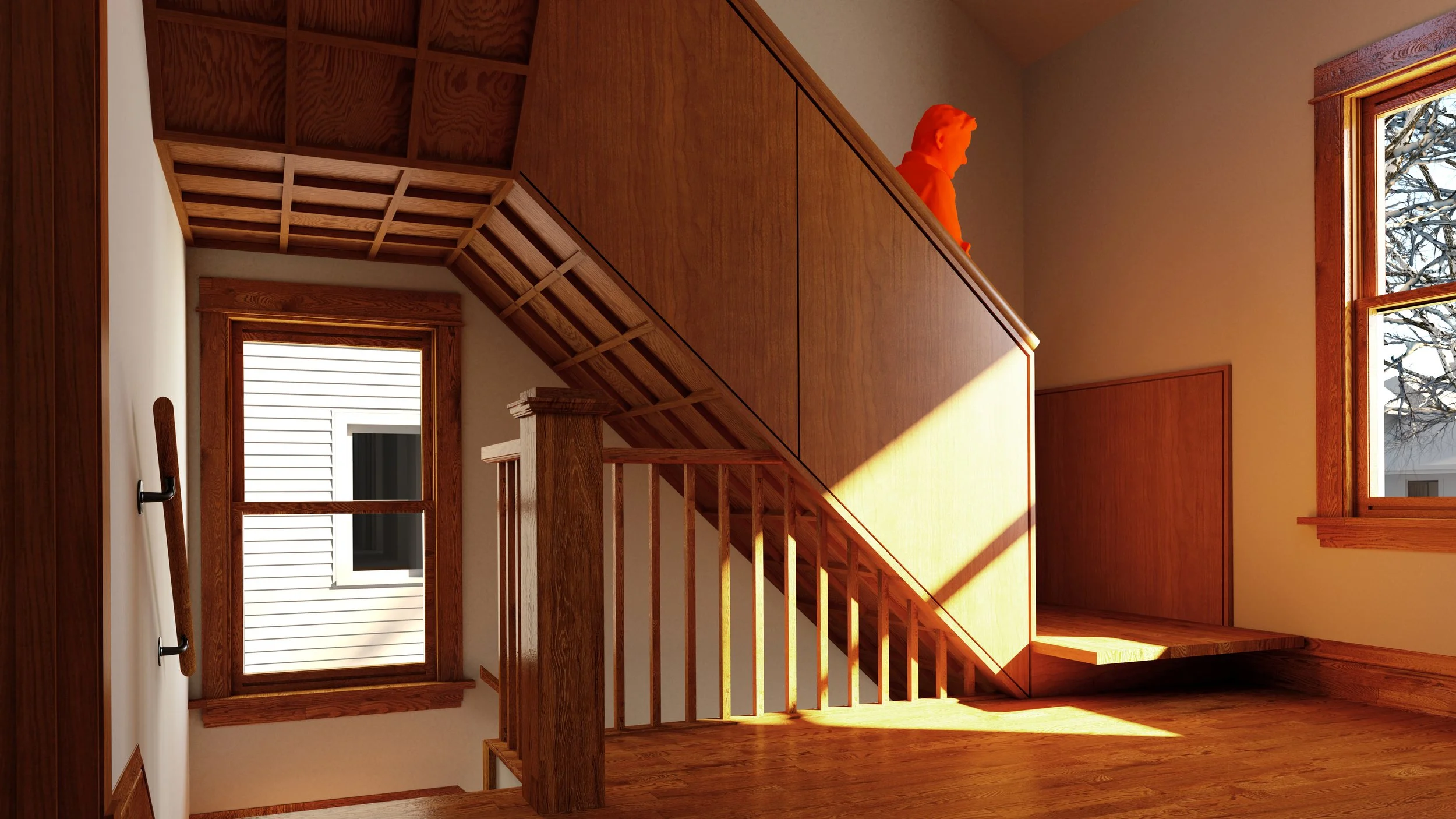 As a mono-medium investigation into expanded habitable space within the tight constraints of a classic American Foursquare, this project draws inspiration from the Prairie and Craftsman wood detailing characteristic of Oak Park, IL.