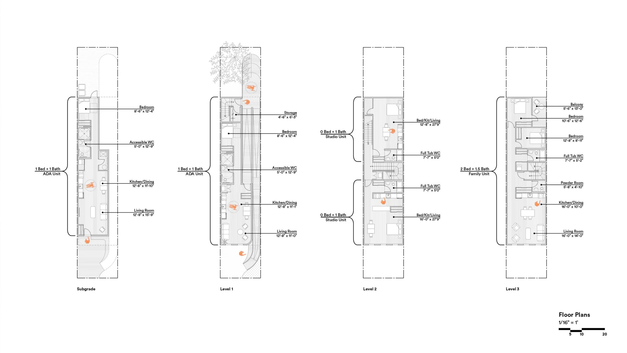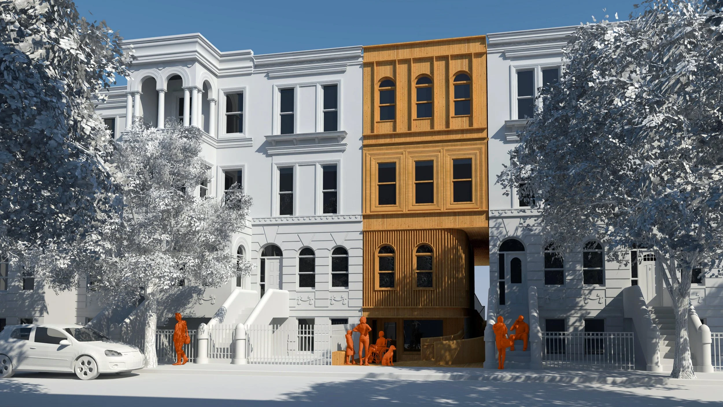 Re-interpreting the iconic New York City Brownstone stoop, Neighborwood is a product of its environment. The design prioritizes both accessibility and local community by offering two exterior gathering spaces linked by an ADA-compliant ramp. This ramp also introduces more natural daylight into the depths of the narrow lot while addressing a range of mobility needs from young families to an aging population that wishes to age-in-place.