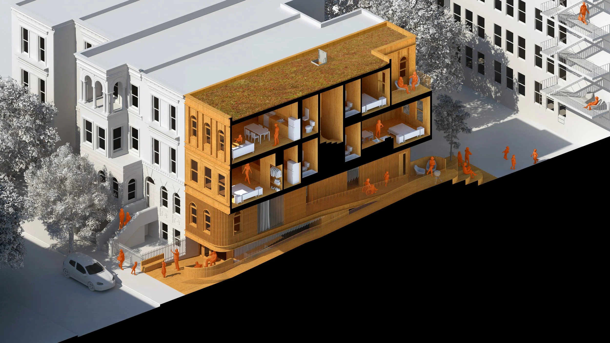 Bringing material warmth and softness to the hardscaped neighborhoods of Harlem NY, Neighborwood utilizes cross-laminated timber technology for both ease of construction and high environmental performance.